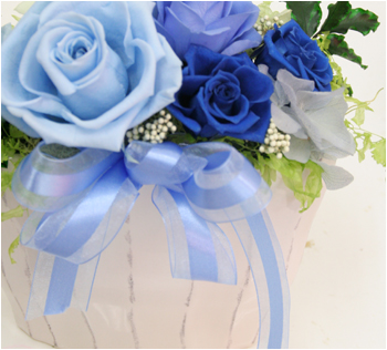 プリザーブドの美しさに自信 一口に「青いバラ」と言っても様々。 店長が各メーカーの青いバラを1つ1つ吟味して「これはキレイ」と自信を持っておススメできるものだけを選びました。 微妙に異なる色のハーモニー。 涼しげな色の裏には店長の熱い情熱がこもっています。 |