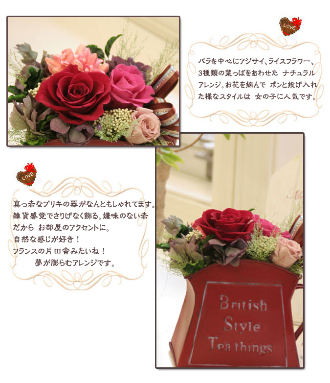 プリザーブドとブリキの器のコンビネーションが とっても新鮮! ありそうでなかったナチュラルアレンジ。 真っ赤なバラで印象的に!お祝いや送別用のギフトに最適です。