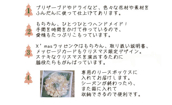 ■初心者さんでも安心 取扱説明書■ 贈物の場合 先方様がプリザーブドのことを ご存じなくてもご安心を。 アレンジ1つにつき1枚 お取り扱い説明書をお付けしています。 注意事項を守ってより長くお楽しみください。 |